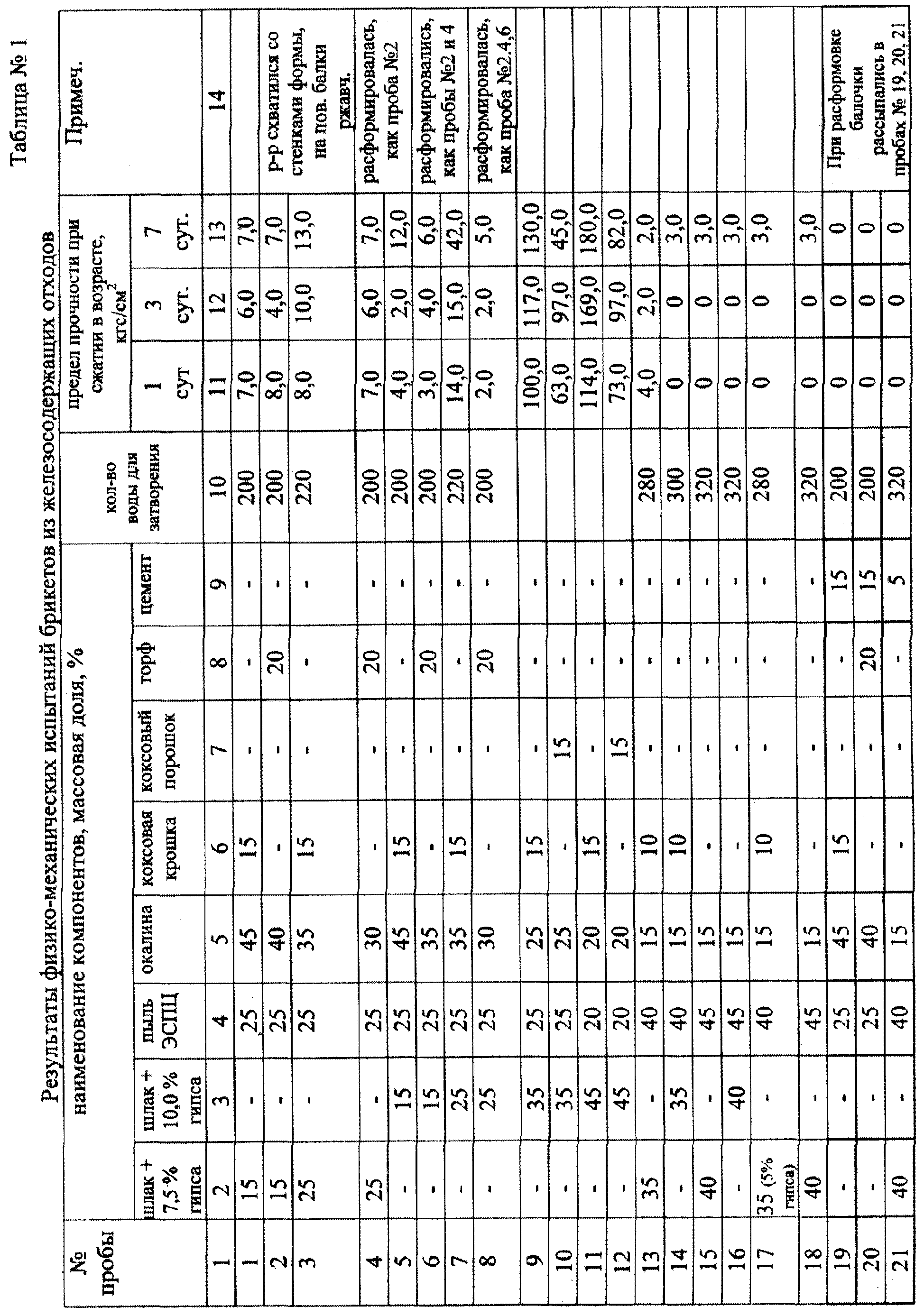 Настоящее изобретение относится к области строительства и металлургии, а именно к производству брикетов для металлургического производства с использованием сульфатно-шлакового вяжущего. В настоящее время отходы металлургического производства частично утилизируется путем использования метода динамического горячего прессования чугунной стружки, а частично используется как связующее вещество для получения качественных брикетов из железных руд и концентратов. Способ брикетирования руд с чугунной стружкой предложен Н.А.Ярхо для криворожских гематитовых руд. Недостатками указанных технических решений являются получение брикетов с относительно невысокими физико-механическими свойствами и недостаточная степень утилизации промышленных отходов, а также обладающих повышенными энергозатратами ввиду необходимости использования при брикетировании большого количества электроэнергии на обжиг, электросушку брикетов. Так, например, известен способ получения брикетов из металлургического сырья (патент РФ В качестве прототипа рассматривается способ изготовления брикетов с холодным вибропрессованием отходов металлургического производства (пат. России Недостатком известных предложений является использование ограниченного диапазона отходов металлургического производства (недостаточная степень их утилизации) и повышение энергоемкости производства. Задачей, на решение которой направлено настоящее изобретение, является разработка технологии получения брикетов для использования в металлургическом производстве с повышенными физико-химическими характеристиками, а именно высокой химической стабильностью и повышенным насыпным весом, порядка 2,7-2,8 т/м3. При решении указанной задачи в процессе производства брикетов обеспечивается защита окружающей среды за счет утилизации отходов и использования шихты на основе вяжущего нормального твердения, обладающего повышенной коррозионной стойкостью. Поставленная задача достигается за счет того, что в способе производства брикетов из железоуглеродистых отходов металлургического производства, заключающемся в том, что готовят смесь с увлажнением водой из окисленных железоуглеродистых отходов металлургического производства, карбюризатора и связующего материала, перемешивают смесь с увлажнением жидкостью, затем укладывают в формы и прессуют, при этом увлажнение осуществляют количеством жидкости в пределах 4-12% от общей массы смеси, после формования смесь подвергают холодному прессованию с одновременным воздействием на смесь вибрации до появления в смеси тиксотропических изменений, при этом в качестве связующего материала применяют рафинировочный шлак, образующийся в процессе вне печной обработки стали на установке печь-ковш, который имеет следующий химический состав (мас.%): SiO2 14-34, AL2О3 1,5-14, CaO 37-64, MgO 3-14, TiO2 0,05-0,5, MnO 0,14-2,6, FeO – менее 0,5. Возможны и другие варианты осуществления способа, согласно которым необходимо, чтобы: – в качестве железосодержащих отходов используют прокатную окалину и плавильную пыль электросталеплавильного процесса; – используемые компоненты смешивали бы в соотношении, мас.%: