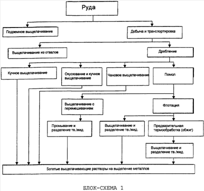 На блок-схеме 1 ниже можно в общем проследить, как отдельные типичные процессы могут быть связаны с доступными в настоящий момент основными методами выщелачивания для обработки руд и концентратов согласно Esteban Domic в Hidrometalurgia – Fundamentos, procesos y aplicaciones, 2001.