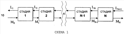 В многостадийной противоточной системе (Фоуст и др. (Foust et al.). Principles of Unit Operations, 1960, pp.43-49) две фазы поступают с противоположных концов последовательности равновесных стадий, как показано на схеме 1 ниже. Фазы текут в противоположных друг другу направлениях. Таким образом может быть повышена концентрация растворимого вещества в продукте фазы-L, и возможно более высокое извлечение растворимого вещества при меньшем количестве растворителя.