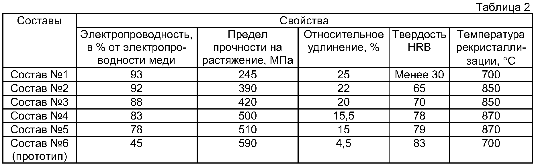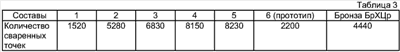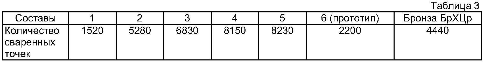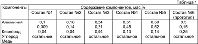 Из уровня техники не известны аналоги, обладающие тождественной совокупностью признаков. Заявляемый материал изготавливают путем механического легирования твердых порошковых компонентов, их оксидов с последующим окислительно-восстановительным отжигом полученных гранул и компактирования гранул путем холодного прессования брикетов и их горячей экструзией. Дефектная структура механолегированных гранул обеспечивает ускорение и полноту прохождения окислительно-восстановительных процессов по сравнению с аналогичной обработкой распыленных порошков. В результате прохождения твердофазных химических реакций, а также реакций окисления-восстановления в газовой фазе образуется структура материала, представляющая из себя медную матрицу с равномерно распределенными чрезвычайно дисперсными (менее 0,05 мкм) упрочняющими фазами оксида алюминия и углерода. Соотношение алюминия и кислорода обеспечивает полный переход алюминия в оксидную фазу, а наличие углерода в указанных количествах обеспечивает дополнительное упрочнение матрицы материала, не уменьшая существенно электропроводности и пластических свойств. Кроме того, углерод играет роль твердой смазки при эксплуатации материала в режиме трения, а также придает материалу антиадгезионные свойства. Пример 1. В соответствии с описанной технологией были изготовлены образцы в виде прутков и профилей из заявляемого материала с различным содержанием компонентов (табл.1). Каждый из составов исследован для определения его физико-механических свойств. Твердость определяли по ГОСТ 2999-75, предел прочности при растяжении ГОСТ 1497-84, относительное удлинение по ГОСТ 1497-84, электропроводность по ГОСТ 7229-76. Температуру рекристаллизации определяли как максимальную температуру, при которой твердость образцов, отожженных в течение 2 часов, измеренная при нормальной температуре, снижена на 15% по отношению к твердости этих же образцов до их отжига. Результаты измерений представлены в табл.2. Из таблицы 2 следует, что при приближении содержания компонентов состава к верхнем пределу механические свойства материала и температура рекристаллизации изменяются незначительно, а электропроводность существенно уменьшается. При содержании компонентов заявляемого состава меньше нижнего предела механические свойства и температура рекристаллизации резко падают. Электропроводность, относительное удлинение и температура рекристаллизации заявляемого материала существенно превышают аналогичные характеристики у прототипа. Следует подчеркнуть, что наиболее важная характеристика материала с точки зрения применения его в электродах контактной сварки и скользящих контактах, работающих при больших токах, – это жаропрочность. Эта величина, характеризующаяся температурой рекристаллизации, в заявляемом интервале составов остается практически постоянной. В связи с изложенным, заявляемое соотношение легирующих компонентов материала следует считать обоснованным. Пример 2. Для оценки возможности применения заявляемого материала для изготовления электродов контактной сварки были изготовлены электроды по ГОСТ 14111-90 из прутков из заявляемого дисперсно-упроченного композиционного материала, материала прототипа и из электротехнической бронзы БрХЦр. Испытания проводились на сварочной машине Н