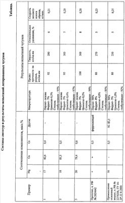 время плавления 60 минут. Лигатуру, полученную в примерах 1-3, использовали для модифицирования чугунов. Испытания проводили на АО «АвтоВАЗ» (г.Тольятти) по программе Способ использования заявляемой лигатуры включал ее дробление до фракции 2-4 кг с последующим введением в расплавленный чугун в количестве 0,65 вес.% (8,0 кг на 1200 кг чугуна) или 0,75 вес.% (9,0 кг на 1200 кг чугуна), или 0,85 вес.% (10,0 кг на 1200 кг чугуна). Затем образцы отливок модифицированных чугунов анализировали по стандартным методикам: – металлографический анализ выполнен с помощью металлографического микроскопа UNIMET 8585, ф. Бюллер; – замеры твердости по Бринеллю производили на твердометре ТБ 5006 (ГОСТ 9012-59); – механические свойства определяли на разрывной машине AMSLER 20ZBDA (ГОСТ 1497-84); – химический анализ проводили на спектроанализаторе Quantovak ARL-2460 и газоанализаторе Leko CS-400; – износостойкость определяли по скорости потери массы испытуемого образца при трении в паре с закаленным диском (Ст 45). Результаты испытаний оказались идентичными для всех количеств лигатуры, введенной в чугун. Составы лигатур и результаты испытаний легированных чугунов в сравнении с известным промышленно освоенным аналогом [См. п. РФ Как видно из приведенных примеров и данных таблицы, применение заявляемой лигатуры, предлагаемых способов ее получения и использования по сравнению с известными объектами того же назначения – промышленно освоенным аналогом [См. п. РФ – получение однородных по всему объему лигатур; – улучшение структуры чугунов, однородности распределения легирующих компонентов при повышенной степени усвоения лигатур; – повышение твердости и износостойкости чугуна за счет образующейся ферритной структуры и компактной шаровидной формы графита; – стабильность и безопасность процессов получения и использования; – снижение затрат на энергоносители (в частности, электрозатрат за счет понижения температуры при получении лигатуры); – уменьшение стоимости используемых компонентов, дающее высокий экономический эффект (например, за счет замены никеля на медь экономический эффект составит 292 млн руб./год только на АО «АвтоВАЗ» – по данным справки заявителя