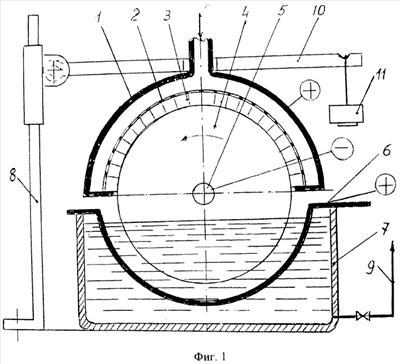 Устройство работает следующим образом. Деталь – катод 4 устанавливается и закрепляется в катододержателе 5 в рабочую позицию над основным полым анодом 1, тампоном 3 и нагружающим механизмом 10, 11. Включается механизм вращения детали – катода 4 и насосно-фильтровальная установка (на чертеже не показана), которая по магистрали 9 подает электролит из ванны 7 в основной полый катод 1. Включается блок электропитания гальванической установки и начинается осаждение металла на детали – катоде как с помощью основного полого анода 1, так и дополнительного анода 6, что увеличивает равномерность структуры гальванического покрытия и производительность процесса при выбранной силе тока.
