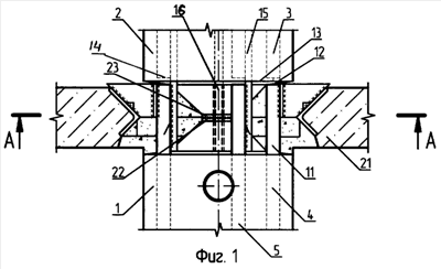 Выпуски 11 арматурных стержней 4 по углам колонны соединены с помощью косынок 18, 19 с обечайкой 20 надколонной плиты 21.