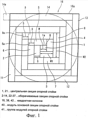 Следовательно, в соответствии с этим вариантом выполнения, когда отдельная квадратная колонна 42 образована соединением большого числа модулей 40 основной секции опорной стойки, возможно свободно задавать размер квадратной колонны 42. Кроме этого, поскольку можно сформировать большое количество центральных секций 1 опорной стойки в одну квадратную колонну 42, становится возможным дальнейшее увеличение прочности на сжатие в аксиальном направлении.
