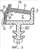 В показанном на фиг.5 варианте верхняя часть профильного уплотнителя имеет несколько большую высоту, чем в других вариантах, причем в данном случае имеющий несколько большую общую длину опорный участок 4 снабжен примерно по середине между канавкой 14 и местом своего примыкания к поперечному участку 7 дополнительной промежуточной перегородкой 25, которая проходит от опорного участка 4 к задней стенке 3 и которая в свою очередь имеет в поперечном сечении показанную на фиг.5 примерно дугообразную форму. Со своей нижней на фиг.5, т.е. обращенной к поперечному участку 7, стороны промежуточная перегородка примыкает к опорному участку 4 с образованием локально уменьшающей его толщину в этом месте выемки 26, которая также образует шарнирное сочленение между примыкающими к нему частями опорного участка 4 при его упругом изгибе в сторону задней стенки 3 в процессе закрывания створки и ее взаимодействия с уплотнителем. С верхней стороны промежуточная перегородка 25 снабжена показанными на фиг.5 небольшими бороздками 27, которые в процессе закрывания створки и ее взаимодействия с уплотнителем облегчают упругий изгиб опорного участка 4, сопровождающийся увеличением кривизны этой промежуточной перегородки 25.
