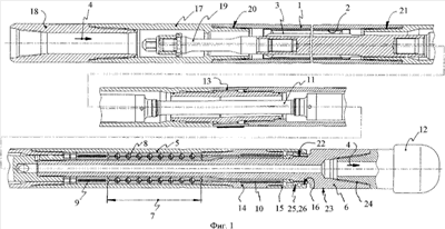 На фиг.1 также показано: поз.17 – верхний переводник двигателя; поз.18 – переводник для соединения с колонной бурильных труб; поз.19 – верхний скважинный ловитель для подъема ротора 3 с корпусом 1, разрушенным по резьбе 20 или 21, а также с корпусом шпинделя 5, ниппелем 14 и долотом 12.
