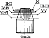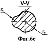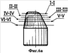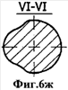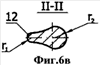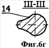 Твердосплавные зубки предлагаемого бурового долота имеют плоскосимметричную форму. Плоскость симметрии 6 делит зубок на две равные половины 7 и 8 (фиг.5б, вид сверху). Боковая поверхность заостренной части обозначена позицией 9, а ее вершинная часть – позицией 10. Две плоские грани или вогнутые криволинейные поверхности обозначены позицией 11, а радиусные переходы – 12. С противоположной стороны от клиновидной вершинной части 10 зубок имеет сфероконическую часть 13, плавно сопрягающуюся с клиновидной вершинной частью 10 поверхностями переходов 14. При этом радиус r1 перехода 12 всегда меньше радиуса r2 сфероконической части 13, что показано на сечениях I-I, II-II, III-III, IV-IV, V-V и VI-VI (фиг.6б-6ж).