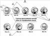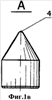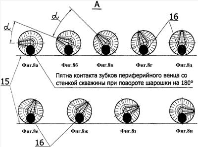 На фиг.3 углом иллюстрируется зазор между телом-гранью зубков и стенкой скважины. Из-за этого зазора разноориентированные зубки, показанные на фиг.4а, 4б, 4з, 4и на развертке периферийного венца шарошки, суммарное количество которых от общего количества на венце составляет 40-50%, вообще лишены возможности калибровать стенку скважины. Зубки, показанные на фиг.4в, 4г, 4е, 4ж, выходят на диаметр долота лишь малым объемом (кромкой). И только зубок на фиг.4д, установленный по образующей периферийного конуса, имеет наибольшее пятно контакта со стенкой скважины.