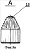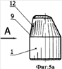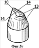 Однако у рассмотренного аналога также имеется серьезный недостаток. При размещении клиновидных зубьев с различной ориентацией на периферийных рядах лишь малая их часть может участвовать в полноценном калибровании стенки скважины. Если зубки с постоянной ориентацией по аналогу все имеют возможность частью своей клиновидной вершины выходить на диаметр долота и калибровать стенку скважины с одинаковой величиной пятен контакта, то из всех зубков на венце с разноориентированной схемой установки калибровать стенку скважины может лишь их малая часть, и то лишь частично. Переменные по величине пятна контакта разноориентированных зубков со стенкой скважины на фиг.4в-4ж обозначены позицией 5.