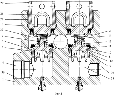 Крышка 3 каждой клапанной полости 2 выполнена с наружным захватом 26 (см. фиг.1) и зафиксирована в клапанной полости гильзой 27, ввернутой снаружи корпуса 1 по резьбовому участку 28 в клапанной полости 2. В корпусе 1 выполнены отверстия 29, в которые ввернуты сливные пробки 30.