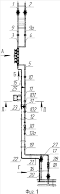 Двадцать первый и двадцать второй узлы обвязки газовой скважины 21, 22 (фиг.1) выполнены в виде трубы, загнутой под углом 45° (фиг.26).