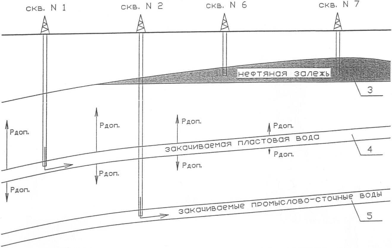 Проводят раздельный сбор попутной пластовой воды и промстоков. Выделяют в разрезе продуктивный пласт 3 с промышленными или остаточными запасами нефти. Затем выявляют ниже продуктивного пласта 3 несколько водоприемных пластов 4 и 5 с необходимыми свойствами: максимальной пористостью и проницаемостью.