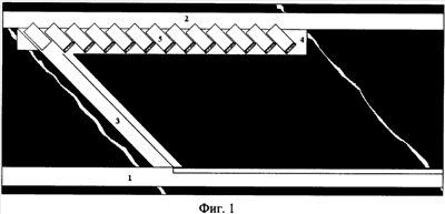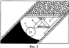 В исходном положении секции 5 установлены вплотную друг к другу боковыми сторонами под углом к линии очистного забоя. Выемка угля осуществляется следующим образом. Сначала демонтируют крепь ската 3 на участке ниже первой секции крепи протяженностью, равной нескольким шагам передвижки секции крепи, и передвигают первую секцию по падению пласта. Затем исполнительным органом второй секции отбивают уголь и передвигают ее. Отбитый уголь исполнительным органом второй секции транспортируется до углеспускного ската 3 и далее самотеком поступает на транспортный штрек 1. По завершении описанного цикла первую секцию опять передвигают вниз по падению, формируя уступную форму очистного забоя. Потом опять передвигают вторую секцию, а затем выемку и транспортирование угля третьей секцией и т.д. При этом уголь, отбитый в зоне выемки третьей секции, исполнительным органом этой секции транспортируется в зону выемки второй секции, а оттуда исполнительным органом второй секции – в углеспускное отделение ската 3. После передвижки первой, второй и третьей секций запускают в работу четвертую секцию и т.д. По мере запуска в работу ранее смонтированных секций в монтажной камере продолжают монтировать дополнительные секции крепи до тех пор, пока работы в монтажной камере 4 не подойдут к проявлению второго горно-геологического нарушения, т.е. линии разрыва сплошности УВМ. В зависимости от прогнозируемой формы проявления данного горногеологического нарушения в границах участка на основании замеров расстояний между нарушениями и определения угла их наклона принимают решение об ограничении наращивания длины очистного забоя. В связи с этим монтируют одну, две или три (в зависимости от газообильности очистного забоя) последних секций. Последние секции крепи отличаются от линейных наличием вентиляционного проема с завальной стороны, обеспечивающего также запасный выход из рабочего пространства в закрепное. После включения в работу последних секций крепи и их передвижки возводят один или два органных ряда 8, ограничивая тем самым зону обрушения пород кровли в выработанном пространстве вынимаемой полосы. В выработанном пространстве между органным рядом и угольным массивом со стороны второго горно-геологического нарушения возводят крепь, сооружая тем самым вентиляционную выработку 9, предназначенную для организации также запасного выхода из забоя. При этом выработке 9 придают угол наклона к линии простирания пласта, равный углу наклона ската 3.