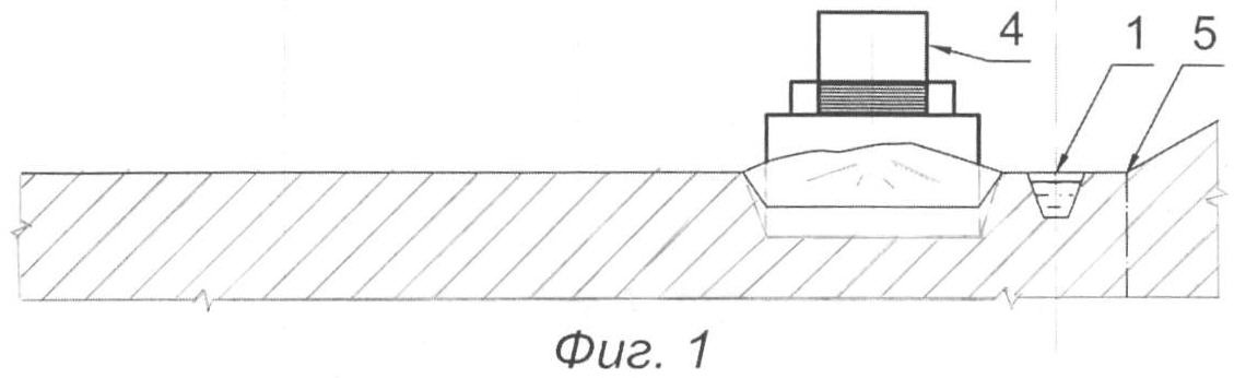 Способ разработки россыпных месторождений иллюстрирован чертежами: на фиг.1 – начало разработки месторождения, фиг.2 – в процессе разработки месторождения, где 1 – дополнительная канава, 2 – траншея, 3 – межтраншейный целик, 4 – бульдозер, 5 – граница отрабатываемых запасов.