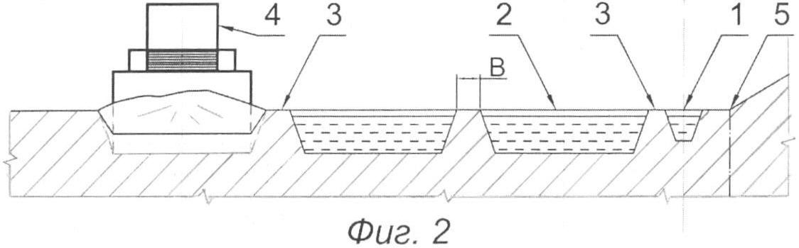 На вскрытом полигоне глинистого россыпного месторождения на границе контуров запасов 5 проходят дополнительную канаву 1, которую заполняют водой (раствором). Разработку месторождения производят параллельными траншеями 2 с применением в качестве выемочного оборудования бульдозеров 4. По завершении проходки каждой траншеи на полную глубину ее заполняют водой, а бульдозер 4 приступает к проходке следующей траншеи 2, оставляя при этом межтраншейный целик 3 шириной по поверхности В. По завершении отработки месторождения по всей ширине его затопляют, а последующую выемку межтраншейных целиков 3 проводят при помощи драги или земснаряда, причем отработка производится по направлению от первой траншеи к последней.