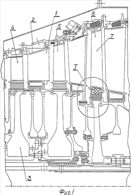 Со стороны входной кромки 14 лопатки 6 на хвостовике 10 размещены уплотняющие пластины 15, выполненные с каналами 16 подвода охлаждающего воздуха 17, соединенные на входе с воздушной полостью 18 ротора 3 турбины 1, а на выходе – через каналы 19 в передних по потоку газа 20 уплотнительных ребрах 21 хвостовика 10 с воздушной полостью 22, образованной хвостовиками 10 соседних лопаток. Полость 22 на выходе каналами 23 в задних ребрах 24 соединена с газовой полостью 25 перед расположенными ниже по потоку газа 20 нижними полками 26 сопловых лопаток 27. Входные в воздушную полость 22 каналы 20 и выходные каналы 23 в переднем 21 и в заднем 24 уплотнительных ребрах выполнены по касательной к боковым поверхностям 11 и 12 хвостовиков 10.
