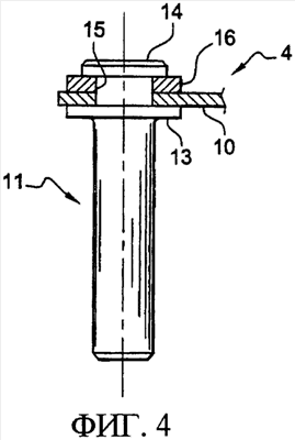 До обжимания штифт представляет собой прямой элемент цилиндрической формы, недалеко от одного из концов которого выступает кольцеобразный фланец 13. Этот фланец 13 является опорой для конца 10 рычага 4, который включает в себя отверстие, в котором закреплен верхний конец 14 штифта. На этом конце штифта 11 поверх фланца 13 находится цилиндрическое осевое расточенное отверстие, предназначенное для обжимания штифта на конце 10 рычага. Обжимание производится путем прессовой посадки соответствующего инструмента в отверстие таким образом, чтобы загнуть вниз и расплющить верхний конец 14 штифта на конце 10 рычага, как показано на фиг.3.