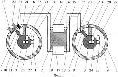 Двигатель также содержит впускной клапан 12, выпускное отверстие 13, перепускной коллектор 14 с клапанами 15 и 16, перепускной коллектор 17 с клапанами 18 и 19, клапаны 20 и 21, форсунку 22, свечу 23 зажигания, фиксаторы 24, 25, 26, 27 положения роторных поршней 4, 5, 6, 7 и датчики 28, 29, 30, 31 положения роторных поршней 4, 5, 6, 7. Роторные поршни 4, 5, 6, 7 установлены с возможностью жесткого соединения с корпусом 1 или жесткого соединения с осью 3 с помощью фиксаторов 24, 25, 26, 27 положения роторных поршней 4, 5, 6, 7 по сигналу от датчиков 28, 29, 30, 31 положения роторных поршней 4, 5, 6, 7. Эти фиксаторы 24, 25, 26, 27 положения роторных поршней 4, 5, 6, 7 могут быть как механическими, так и электромагнитными. Перепускные коллекторы 14 и 17 и клапаны 15, 16, 18, 19, 20, 21 установлены в перегородке 2 между рабочими полостями. При этом всасывающая камера 8 снабжена впускным клапаном 12, компрессорная камера 9 – выпускным клапаном 20, камера 10 сгорания – клапаном 21 для впуска сжатого воздуха, форсункой 22 и свечой 23 зажигания, а выхлопная камера 11 – выпускным отверстием 13. Клапаны 20 и 21 являются общими для перепускных коллекторов 14, 17. При этом клапан 20 установлен в начале воздуховода 32, а клапан 21 – в конце воздуховода 33.