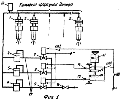 При режиме холостого хода контактор KB (см. фиг.2) будет отключен, и тогда через автомат АВ и блокировочный контакт КВ1 включится электропневматический клапан 7, что обеспечит подвод воздуха к пневмодогружателям форсунок через пневморедуктор при всех частотах вращения коленчатого вала дизеля.