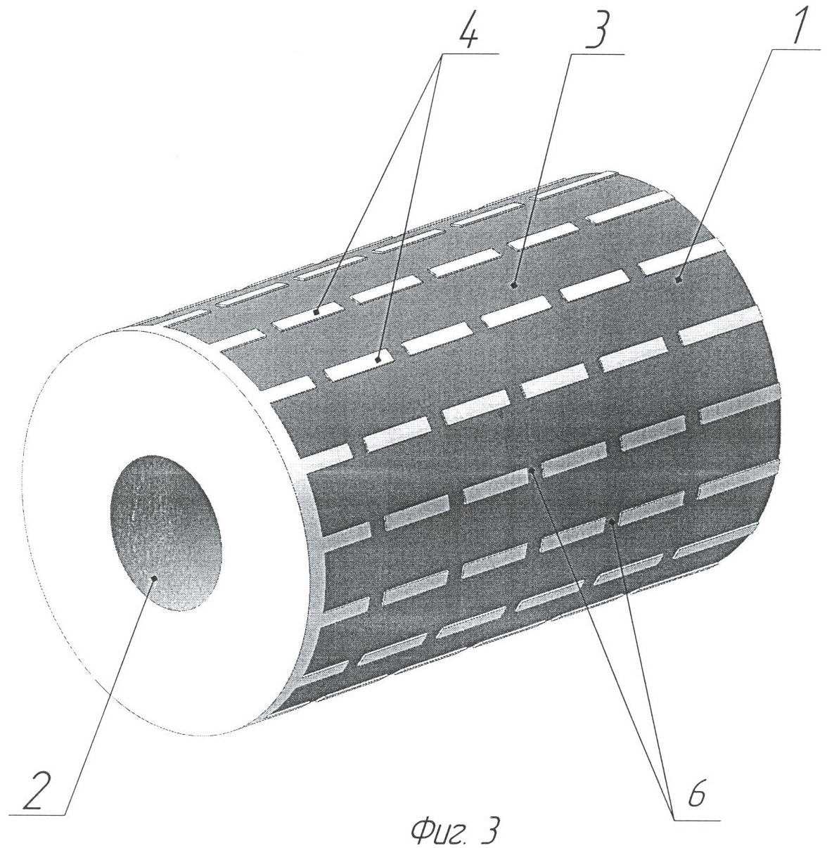 Fсв – площадь свободного прохода газов у соплового торца заряда, а бронирующие полосы выполнены прерывистыми по длине заряда с интервалом прерывистости 1,0-2,0 мм и обеспечением массы разделенных прерывистостью секций бронеполосы не более 1,5 г.