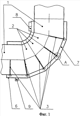 Колено установлено в наружном кожухе 6 и образует ним влагосборную камеру 7, которая сообщена с полостью колена посредством влагозаборных щелей 3. Камера 7 патрубком 8, установленным в верхней части кожуха 6, соединена с системой регенерации турбины (на чертеже условно не показана). Для удаления влаги из камеры 7 в нижней части кожуха 6 предусмотрен патрубок 9.