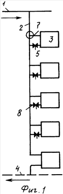 Теплоноситель из котла по вертикальному стояку 2 поступает в расширительный бак и по прямой линии 1 поступает в многочисленные стояки 2, в ускорителе 6 циркуляции кинетическая энергия теплоносителя частично преобразуется в энергию циркуляционного давления и теплоноситель по подводке 7 поступает в прибор 3 отопления, где охладившись, по трубке 8 для отвода теплоносителя через регулирующее устройство 5 снова поступает в стояк 2, где смешавшись с более горячим теплоносителем, опускается вниз и в приборе 3 отопления нижерасположенного этажа происходит то же самое. На первом этаже теплоноситель, потерявший значительное количество тепла, по полнопроточной схеме проходит через прибор 3 отопления и поступает в обратную линию 4 и далее в котел. Таким образом, осуществляется естественная циркуляция теплоносителя в автономной системе отопления многоквартирных многоэтажных домах, при этом на порядок возрастает надежность теплоснабжения, при этом, как показали практические испытания ускорителя 6 циркуляции, коэффициент затекания приборов 3 отопления увеличился на 25% по сравнению со стояками, выполненными по традиционной схеме.