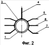 На фиг.1 представлена тепловая панель с элементами оребрения, имеющими одну плоскость симметрии. На фиг.2 представлен элемент оребрения с семью ребрами, симметричными одной плоскости симметрии (поперечное сечение). На фиг.3 представлен элемент оребрения с тремя ребрами, симметричными одной плоскости симметрии (поперечное сечение). На фиг.4 показана тепловая панель с элементами оребрения, имеющими три ребра (вид сбоку). На фиг.5 показана тепловая панель с элементами оребрения, расположенными на соседних трубах с разворотом на 180° (вид сбоку). На фиг.6 представлен элемент оребрения с ребрами, симметричными двум плоскостям симметрии (поперечное сечение). На фиг.7 показана труба тепловой панели с установленными на нее элементами оребрения, поперечный вид которых показан на фиг.2. Элементы оребрения расположены относительно соседних элементов оребрения со смещением вокруг продольной оси трубы на 90 градусов.