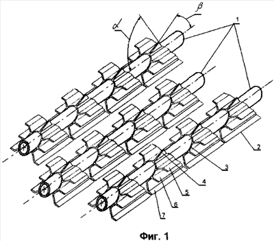 Заявленная совокупность признаков, а именно расположение элементов оребрения на трубе относительно элементов оребрения на соседних трубах со смещением в направлении продольной оси трубы, выполнение элементов оребрения с торцами, скошенными под углом к продольной оси трубы, при наличии на обечайках элементов оребрения, по меньшей мере, трех продольных ребер, размещенных по окружности обечайки симметрично плоскости, проходящей через продольную ось трубы, позволяет: