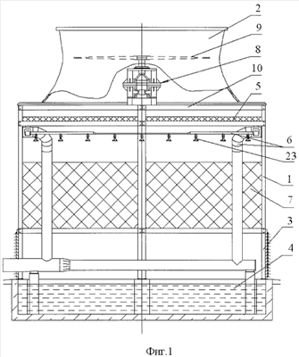 Вращающееся от электропривода 8 лопастное колесо 9 вентилятора осуществляет подсос воздуха в корпус 1 через выполненные в нижней части корпуса 1 градирни воздухозаборные окна 3. Вода через водораспределительную систему 6 подается в разбрызгивающие сопла 23, откуда она в виде капель попадает на поверхность оросителя 7, заполняющего большую часть объема между бассейном 4 и разбрызгивающими соплами 19 водораспределительной системы 6, по которой вода в виде тонкой пленки стекает в бассейн 4. При этом стекающая пленка воды обдувается потоком воздуха, создаваемым лопастным колесом 9 вентилятора. Атмосферный воздух продувается через ороситель 7, что способствует его интенсивному насыщению испаряемой влагой по всей высоте оросителя 7 и интенсивному охлаждению воды. Нагретый воздух лопастным колесом 9 вентилятора через диффузор 2 выбрасывается в атмосферу, а каплеуловитель 5 препятствует уносу капель жидкости из градирни вместе с потоком воздуха, созданным лопастным колесом 9 вентилятора.