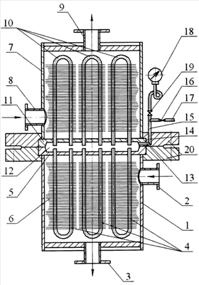 Система регулирования давления в тепловых трубах, состоящая из регулирующего вентиля 16, мановакуумметра 17 и вентиля 19 позволяет регулировать давление в тепловых трубах, производить отсос неконденсирующихся газов, а также с помощью периодического отбора проб пара через вентиль 19 из общей камеры 12 делает возможным обнаружение проникновения греющей или нагреваемой среды в общую камеру 12 (случае разгерметизации соединения тепловые трубы – общая камера), что позволяет заранее предотвратить смешивание сред и избежать технологических и экологических проблем, например, в маслоохладителях – попадание масла в воду, сбрасываемую в водоем, и др.