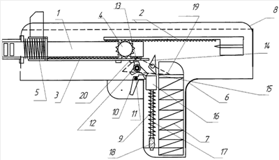 Переводчик-предохранитель 15 во включенном состоянии блокирует спусковой крючок 10, балансир 3 и шептало 12 и имеет выступ 19 для взаимодействия с подавателем магазина при приходе его в крайнее верхнее положение. Переключение режимов огня осуществляется путем более энергичного нажатия на спусковой крючок 10, причем в начале своего хода он отжимает вниз автоспуск 14 с замедлителем 16, а затем высвобождает их.