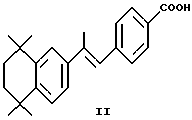 Соединения формулы I также могут использоваться по существу подобным ретиноидам образом для лечения (как химиопрофилактически, так и терапевтически) различных опухолей. Для соединений согласно настоящему изобретению противоопухолевая доза, которую необходимо ввести, будь то разовая доза, многократная доза или дневная доза, будет, разумеется, изменяться в зависимости от конкретного применяемого соединения в связи с различной эффективностью соединений, выбранного способа введения, размера реципиента, типа опухоли и характера состояния пациента. Дозировка, которую следует ввести, не находится в определенных границах, однако обычно она должна представлять собой эффективное количество, или эквивалент, в молярном выражении, фармакологически активной свободной формы, образующейся в процессе метаболического выделения активного медикамента из дозы рецептуры, необходимой для достижения желаемых фармакологических и физиологических эффектов. Для онколога – специалиста в области лечения рака – будет возможным, не прибегая к нежелательному эксперименту, установить распорядок введения соединений согласно настоящему изобретению таким путем, как обращение к ранее опубликованным работам по ретиноидам, как установлено, обладающим противоопухолевыми свойствами. Например, для предотвращения первичной множественности опухолей соединениями формулы I в случае плоскоклеточного рака головы и шеи онколог может обратиться к работе Hong, W.K. et al., N.Engl.J.Med., 1990, 323, p. 795. Для лечения острого промиелоцитного лейкоза можно обратиться к работе Huang, М. et al., Blood, 1988, 72, р. 567.