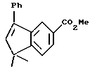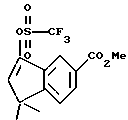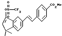 ПРИМЕР 140Метиловый эфир 4-[2-[1,1-диметил-3- (трифторметансульфонил-окси)-1Н-инден -5-ил]винил]бензойной кислоты ![]() К раствору метилового эфира 4-[2-(1,1-диметил-3-оксоиндан-5- ил)винил] бензойной кислоты (450 мг, 1,40 ммоль) и 2,6-ди-трет-бутил-4-метилпиридина (345 мг, 1,68 ммоль) в 5 мл метиленхлорида добавляли ангидрид трифторметансульфоновой кислоты (434 мг, 1,54 ммоль) при -78oC. После перемешивания при комнатной температуре в течение 16 ч смесь разбавляли 1 н. HCl (20 мл) и экстрагировали этиловым эфиром (20 мл х 3). Объединенные экстракты сушили над сульфатом магния и выпаривали. Остаток очищали при помощи флэш-хроматографии (CH2Cl2: гексан = от 1:2 до 1:1) с получением 606 мг (выход 95%) указанного в заголовке соединения в виде твердого вещества; 1H-ЯМР (CDCl3): 1,41 (с, 6Н), 3,94 (с, 3H), 6,27 (с, 1Н), 7,15 (д, J=16,3 Гц, 1Н); 7,23 (д, J= 16,3 Гц, 1Н); 7,37 (д, J=8,2 Гц, 1H); 7,49 и 7,50 (д поверх с, J=8,2 Гц, 2Н), 7,59 (д, J=8,4 Гц, 2Н), 8,05 (д, J=8,4 Гц, 2Н); MS m/e: 453 (МН+).