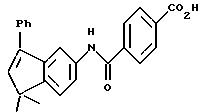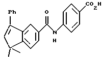 ПРИМЕР 1504-[[[(5,6-Дигидро-5,5- диметил-8-фенил)-2-нафталенил]- карбонил]амино]- 2-фторбензойная кислота (I4k) ![]() Используя описанный метод получения (8-фенил)-производного 4а, из 240 мг (0,54 ммоль) соединения I3k получили 175 мг (выход 78%) указанного в заголовке соединения; 1H-ЯМР (ДМСО-d6): 12,98 (ушир.с, 1Н), 10,58 (с, 1Н), 7,89-7,77 (м, 2Н), 7,73 (д, J=1,5 Гц, 1Н), 7,54 (д, J=8,1 Гц, 1Н), 7,44-7,30 (м, 7Н), 6,06 (т, J=4,5 Гц, 1Н), 2,34 (д, J=4,5 Гц, 2Н), 1,31 (с, 6Н); MS (DCI) m/e: 416 (МН+); ИК (KBr): 2960, 1692, 1596, 1526.