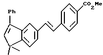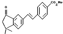 ПРИМЕР 139Метиловый эфир 4-[2-(1,1-диметил-3 -оксоиндан-5-ил)винил] бензойной кислоты (LXXVa) ![]() 6-Бром-3,3-диметилиндан-1-он (1,20 г, 5,02 ммоль), метил-4-винилбензоат (1,63 г, 10,0 ммоль), ацетат палладия (56 мг, 0,25 ммоль), гидрат хлорида тетрабутиламмония (1,53 г, 5,52 ммоль) и бикарбонат натрия (1,05 г, 12,6 ммоль) перемешивали в 10 мл безводного N,N-диметилформамида при 80-100oC в течение 8 часов. Смесь разбавляли водой (100 мл) и экстрагировали метиленхлоридом (50 мл х 3). Объединенные экстракты сушили над сульфатом магния и выпаривали. Остаток очищали при помощи флэш-хроматографии (CH2Cl2:гексан = от 1: 1 до 1:0, затем CH2Cl2: EtOAc = 10:1) с получением 1,12 г (выход 70%) указанного в заголовке соединения в виде твердого вещества желтого цвета; 1H-ЯМР (CDCl3): 1,45 (с, 6Н), 2,64 (с, 2Н), 5,30 (с, 3H), 7,18 (д, J=16,5 Гц, 1Н); 7,52 (д, J=8,1 Гц, 1Н); 7,58 (д, J=8,5 Гц, 2Н); 7,78 (д, J=1,7, 8,1 Гц, 1Н), 7,86 (д, J=1,7 Гц, 1Н), 8,05 (д, J=8,5 Гц, 2Н); MS m/e: 321 (МН+).