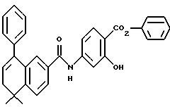 ПРИМЕР 144Фениловый эфир 4-[[[(5,6-дигидро -5,5-диметил-8- фенил)-2-нафталенил] карбонил] амино]-2-гидроксибензойной кислоты (I3j) ![]() Используя описанный метод получения 8-(2-фтор-фенил)-производного I3g, из 230 мг (0,83 ммоль) соединения XVIIIa и фенил-4-аминосалицилата (Aldrich, 190 мг, 0,83 ммоль) получили 193 мг (выход 48%) указанного в заголовке продукта;1H-ЯМР (CDCl3): 8,03 (д, J=9,3 Гц, 1H), 7,75-7,71 (м, 2Н), 7,51-7,19 (м, 13H), 6,09 (т, J=4,5 Гц, IH), 2,40 (д, J=4,5 Гц, 2Н), 1,38 (с, 6Н); MS (DCI) m/e: 490 (МН+).