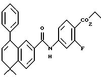 ПРИМЕР 149Этиловый эфир 4-[[[(5,6-дигидро-5,5 -диметил-8-фенил)-2- нафталенил] карбонил] амино]-2-фторбензойной кислоты (I3k) ![]() Используя описанный метод получения 8-(2-фторфенил)-производного I3g, из 250 мг (0,90 ммоль) соединения XVIIIa и этилового эфира 2-фтор-4-амино-бензойной кислоты (181 мг, 0,99 ммоль) получили 240 мг (выход 60%) указанного в заголовке продукта;1H-ЯМР (CDCl3): 7,91 (т, J=8,5 Гц, 1Н), 7,72 (д, J=10,1 Гц, 1Н), 7,66 (д, J=1,8 Гц, 1Н), 7,51-7,48 (м, 1Н), 7,44-7,35 (м, 6Н), 7,20 (д, J= 8,6 Гц, 1Н), 6,08 (т, J=4,5 Гц, 1Н), 4,37 (кв, J=7,1 Гц, 2Н), 2,40 (д, J=4,5 Гц, 2Н), 1,38 (т, J=7,1 Гц, 3H), 1,37 (с, 6Н); MS (DCI) m/e: 444 (МН+).