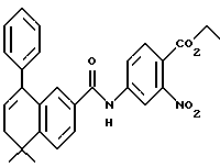 ПРИМЕР 154Этиловый эфир 4-[[[(5,6-дигидро-5,5 -диметил-8-фенил)-2- нафталенил]карбонил] амино]-2-нитробензойной кислоты (I3l). ![]() Используя описанный метод получения 8-(2-фторфенил)-производного I3g, из 199 мг (0,71 ммоль) соединения XVIIIa и 140 мг (0,78 ммоль) этилового эфира 4-амино-2-нитробензойной кислоты получили 155 мг (выход 46%) указанного в заголовке продукта;1H-ЯМР (CDCl3): 8,15 (с, 1Н), 7,84 (с, 1Н), 7,79 (с, 1Н), 7,73 (дд, J= 8,1, 1,9 Гц, 1Н), 7,52-7,49 (м, 2Н), 7,41-7,26 (м, 5Н), 6,09 (т, J= 4,5 Гц, 1Н), 4,36 (кв, J=7,2 Гц, 2Н), 2,40 (д, J=4,5 Гц, 2Н), 1,37 (с, 6Н), 1,34 (т, J=7,2 Гц, 3H); MS (DCI) m/e: 471 (MH+).