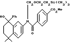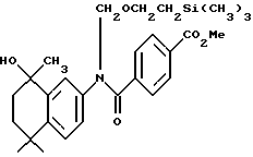 ПРИМЕР 10Метиловый эфир N-[2-(триметилсилил) этоксиметил]-4- [[(5,6,7,8-тетрагидро- 5,5,8-триметил-8-гидрокси -2-нафталенил) амино] карбонил]бензойной кислоты (XIb) ![]() К раствору соединения Xa (438 мг, 0,91 ммоль) в безводном тетрагидрофуране (10 мл) при -78oC добавляли бромид метилмагния (3,0 М раствор в диэтиловом эфире, 0,43 мл, 1,30 ммоль). После выдерживания в течение 10 минут при -78oC реакционной смеси давали нагреться до комнатной температуры. После 3-часового выдерживания при комнатной температуре реакционную смесь разбавляли этилацетатом (100 мл) и промывали водой (100 мл). Органическую фазу выпаривали и остаток хроматографировали на силикагеле (элюируя 20% этилацетатом в гексане) с получением 90 мг (выход 20%) указанного в заголовке соединения; 1H-ЯМР (CDCl3): 7,90 (м, 2Н), 7,40 (м, 2Н), 7,25 (м, 2Н), 7,10 (м, 1Н), 5,25 (м, 2Н), 3,90 (с, 3H), 3,70 (м, 2Н), 1,90 (т, J=7,0 Гц, 2Н); 1,75 (т, J=7,0 Гц, 2Н); 1,30 (с, 3H), 1,29 (с, 3H), 1,27 (с, 3H), 1,00 (т, J=8,0 Гц, 3H), 0,00 (с, 9Н); MS (DCI) m/e: 480 (МН+ – H2O).