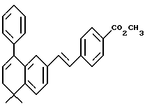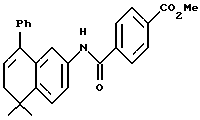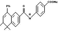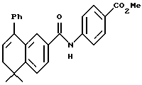 ПРИМЕР 22Метиловый эфир 4-[[(5,6-дигидро-5,5- диметил-8-фенил-2- нафталенил)карбонил] амино]бензойной кислоты (I3a) ![]() Раствор соединения (XVIIIa) (135 мг, 0,485 ммоль) в тионилхлориде (5 мл) с 2 каплями N, N-диметилформамида перемешивали при комнатной температуре. Смесь становилась гомогенной в течение 1 часа, после чего ее упаривали в вакууме. Затем остаток растворяли в безводном пиридине (5 мл), к которому был добавлен метил-4-аминобензоат (фирмы Aldrich, 0,534 ммоль, 81 мг). После выдерживания в течение 16 часов при комнатной температуре смесь разбавляли 1 н. HCl, экстрагировали этилацетатом (100 мл), промывали 1 н. HCl (3 х 100 мл) и промывали насыщенным бикарбонатом натрия (2 х 100 мл). Затем органическую фазу отделяли, сушили над сульфатом магния и упаривали в вакууме с получением 68 мг (выход 34%) указанного в заголовке соединения; 1H-ЯМР (CDCl3): 8,05 (д, J=7,0 Гц, 2Н), 7,75 (м, 2Н), 7,65 (д, J=7,0 Гц, 2Н), 7,50 (м, 1Н), 7,40 (м, 5Н), 6,08 (т, J=4,6 Гц, 1Н), 3,90 (с, 3H), 2,45 (т, J=4,6 Гц, 2Н), 1,40 (с, 6Н); MS (DCI) m/e: 412 (МН+).