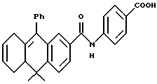 ПРИМЕР 1554-[[[(5,6-Дигидро-5,5-диметил-8- фенил)-2-нафталенил]-карбонил]амино]-2- нитробензойная кислота (I4l) ![]() Используя описанный метод получения (8-фенил)-производного 4а, из 155 мг (0,33 ммоль) соединения I3l получили 105 мг (выход 72%) указанного в заголовке соединения; 1H-ЯМР (ДМСО-d6): 13,65 (ушир.с, 1Н), 10,76 (с, 1H), 8,31 (д, J= 1,7 Гц, 1H), 7,99 (дд, J=8,3, 1,7 Гц, 1Н), 7,90-7,84 (м, 2Н), 7,55 (д, J=8,3 Гц, 1H), 7,47 (д, J=1,7 Гц, 1H), 7,44-7,30 (м, 5Н), 6,07 (т, J= 4,5 Гц, 1H), 2,33 (д, J=4,5 Гц, 2Н), 1,31 (с, 6Н); MS (DCI) m/e: 443 (MH+); ИК (KBr): 2960, 1702, 1542, 1518.