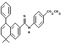 ПРИМЕР 14Метиловый эфир 4-[[(5,6-дигидро-5,5-диметил-8- фенил-2-нафталенил)амино] карбонил]бензойной кислоты (I1c) ![]() К раствору соединения XIc (в виде моногидрата, 449 мг, 0,83 ммоль) в толуоле (10 мл) добавляли п-толуолсульфоновую кислоту (190 мг, 1,0 ммоль). После нагревания при 75oC в течение 0,5 часа реакционную смесь разбавляли этилацетатом (100 мл) и промывали насыщенным раствором бикарбоната натрия (100 мл). Органическую фазу упаривали в вакууме и остаток хроматографировали на силикагеле (элюируя 15% этилацетатом в гексане) с получением 162 мг (выход 48%) указанного в заголовке соединения; 1H-ЯМР (CDCl3): 8,15 (д, J= 8,5 Гц, 2Н), 7,90 (д, J=8,5 Гц, 2Н), 7,90 (м, 1Н), 7,65 (м, 1Н), 7,40 (м, 5Н), 6,90 (м, 1Н), 6,05 (т, J=4,6 Гц, 1Н), 3,95 (с, 3H), 2,40 (д, J=4,6 Гц, 2Н), 1,40 (с, 6Н); MS (DCI) m/e: 412 (МН+).