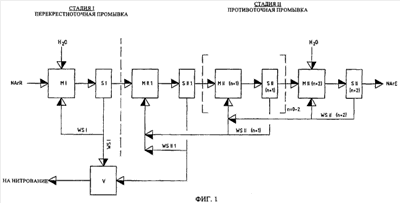 На фиг.1 в качестве примера показана технологическая схема, иллюстрирующая предлагаемый в изобретении способ двухстадийной промывки, выполняемой для регенерации серной кислоты, азотной кислоты и нитрозы из нитроароматических соединений. Сырое нитроароматическое соединение (NArR) из процесса нитрования вместе со свежей водой или конденсатом со стадии концентрирования кислоты и циркулирующей в замкнутом контуре промывочной кислотой (WS I), отбираемой из сепаратора (S I), подают в смеситель (М I) на стадию I промывки (перекрестноточной промывки). В сепараторе (S I) происходит деэмульгирование эмульсии, состоящей из нитроароматического соединения (NArR) и промывочной кислоты (WS I). Промывочную кислоту (WS I) подают из сепаратора (S I) обратно в смеситель (М I) только в таком количестве, которое необходимо для поддержания объемного соотношения между промывочной кислотой и нитроароматическим соединением в смесителе на заданном уровне. Избыток промывочной кислоты (WS I) направляют в сборник (V). Из сепаратора (S I) нитроароматическое соединение (NArR) вместе с избыточной промывочной кислотой (WS II (n+1)) и циркулирующей в замкнутом контуре промывочной кислотой (WS II 1), отбираемой из сепаратора (S II 1), подают в смеситель (MII 1) на стадию II промывки (противоточной экстракционной обработки). С выхода смесителя (MII 1) полученную в нем в результате промывки эмульсию подают на разделение ее фаз в сепаратор (S II 1), отбираемую из которого промывочную кислоту (WS II 1) подают обратно в смеситель (MII 1) в таком количестве, которое необходимо для поддержания в нем объемного соотношения между нитроароматическим соединением и водой на заданном уровне. Избыток промывочной кислоты (W II 1) направляют в сборник (V) и из него вместе с промывочной кислотой (WS I) непосредственно либо после дополнительного промежуточного концентрирования возвращают в процесс нитрования. Нитроароматическое соединение (NArR) из сепаратора (S II 1) вместе с циркулирующей в замкнутом контуре промывочной кислотой (WS II (n+1)), отбираемой из сепаратора (S II (n+1)), и избытком промывочной кислоты, отбираемой из сепаратора (S II (n+2)), подают в смеситель (М II (n+1)). С выхода смесителя (М II (n+1)) полученную в нем в результате промывки эмульсию подают на разделение ее фаз в сепаратор (S II (n+1)), отбираемую из которого промывочную кислоту (WS II (n+1)) подают обратно в смеситель (М II (n+1)) в таком количестве, которое необходимо для поддержания в нем объемного соотношения между нитроароматическим соединенинм и промывочной кислотой на заданном уровне. Избыток промывочной кислоты (WS II (n+1)) подают в смеситель (М II 1). Подобный процесс повторяют n раз, где n соответствует количеству стадий промывки. В последний смеситель (М II (n+2)) подают подвергаемое промывке нитроароматическое соединение из сепаратора (S II (n+1)) вместе со свежей водой или конденсатом со стадии концентрирования кислоты и промывочной кислотой (WS II (n+2)) из сепаратора (S II (n+2)). С выхода смесителя (М II (n+2)) полученную в нем в результате промывки эмульсию подают на разделение ее фаз в сепаратор (S II (n+2)), отбираемую из которого промывочную кислоту (WS II (n+2)) подают обратно в смеситель (М II (n+2)) в таком количестве, которое необходимо для поддержания в нем объемного соотношения между нитроароматическим соединением и промывочной кислотой на заданном уровне. Избыток промывочной кислоты (WS II (n+2)) подают в смеси