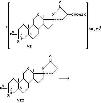 Примеры с енаминной защитойПример 11. 3-(1-Пирролидинил)-андроста-3,5-диен-17-он (II, 5 и R6 вместе пирролидиновый заместитель) К суспензии 10 г АД в 40 мл метанола, нагретой до температуры кипения, добавляют медленно 5 мл пирролидина. По окончании реакции реакционную массу охлаждают до температуры 0-5oC. Осадок отфильтровывают, промывают на фильтре охлажденным метанолом. Получают 10,7 г (90%) пирролидинового енамина АД с температурой плавления 217-220oC. Пример 12. 3-(4-Морфолинил)-андроста-3,5-диен-17-он (II, R5 и R6 вместе морфолиновый заместитель) К суспензии 20 г АД в 120 мл бензола добавляют 50 мл морфолина и 0,03 г n-толуолсульфокислоты. Смесь кипятят, периодически удаляя отделяющуюся воду. По окончании реакции реакционную массу охлаждают до комнатной температуры. Растворитель упаривают в вакууме до прекращения погона. К остатку добавляют 10 мл петролейного эфира (фракция с температурой кипения 70-90oC). Осадок отфильтровывают, промывают петролейным эфиром. Получают 23,8 г (95,9%) морфолинового енамина АД с температурой плавления 205-207oC. Источники информации 1. Enlinger E., Magnus P. J.Am.Chem.Soc., 1980, v.102, 15, p.5004-5011. 2. Sturtz G., Yanakej J., Synthesis, 1980, 4, p.289-291. 3. Pat. US 3738983, 1974 г. 4. Pat. US 3682894, 1973 г. 5. Pat. US 4057542, 1977 г. 6. Заявка Японии 57-85400, 1978 г. 7. Заявка Японии 57-197300, 1978 г. 8. Pat. US 4265816, 1980 г. 9. Заявка Японии 61-359, 1981 г. 10. Pat. US 4211701, 1980 г. 11. Заявка Японии 53-124252, 1974 г. 12. Pat. FR 2216273, 2281357, 1974 г. Формула изобретения