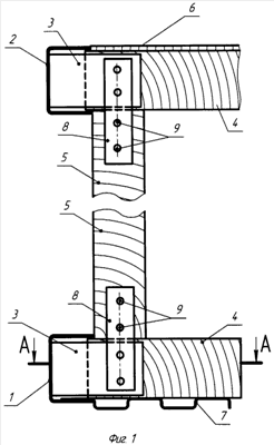 Соединяемые строительные элементы (фиг.1 и 2) состоят из изготовленных -образных профилей каркасов основания 1 и покрытия 2, внутри которых сваркой закреплены пластины 3 с выступающими за профиль сторонами, на которых размещены отверстия для болтовых соединений. Между парными пластинами 3 установлены деревянные балки 4, на которых сверху каркаса покрытия 2 расположена панель покрытия 6, а снизу каркаса основания 1 – гофрированное покрытие 7. Деревянные стойки 5 установлены торцами на балках 4 каркасов основания и покрытия. Поверх пластин 3 и стоек 5 расположены вертикально планки 8, которые сквозными болтовыми соединениями 9 обеспечивают жесткую связь балок каркасов со стойками.