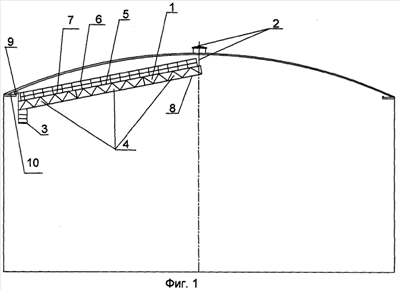 Роликовый каток 9, прикрепленный с другого конца наклонной поворотной стрелы 1 к верхнему поясу 7 секции фермы 4, устанавливают на технологическое опорное кольцо 10, выполненное по внутреннему периметру ремонтируемого объекта и расположенное в месте соединения купола и вертикальной стены.