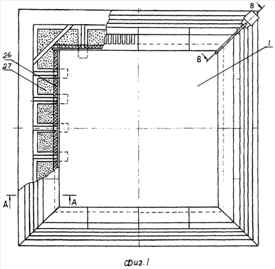 На Фиг.1 показан плавательный бассейн, вид сверху, на Фиг.2 – разрез А-А на Фиг.1, на Фиг.3 – разрез В-В на Фиг.1, на Фиг.4 – разрез С-С на Фиг.1. Бассейн состоит из резервуара 1 и расположенного по его периметру переливного желоба 2, включающего соединенное со стенками резервуара дно 3 и заднюю стенку 4, обращенных к переливному желобу 2 решеток 5, опирающихся нижней обрамляющей планкой 7 на кромку переливного коврика 8, закрепленного к гидроизоляционной пленке 9 вдоль кромки дна 3 переливного желоба 2. В угловых частях резервуара 1 установлены емкости 10, две стенки которых прилегают к стенкам резервуара 1 бассейна и закреплены к задней стенке 4 переливного желоба 2 планками 11. К верхней кромке третьей стенки емкости 10 закреплен угольник 12. Дно емкости 10 снабжено отверстием, в которое установлен стакан 13 с возможностью установки в него погружного центробежного электронасоса 14. На дно емкости 10 установлена дренажная решетка 15, на которую уложены три слоя фильтрующего материала 16. На стягивающие опорные столбы 17 тросы 18 в месте их перекрещивания установлена опора 19, состоящая из четырех изогнутых по радиусу до четверти круга и соединенных между собой под прямым углом при виде сверху ножек 20, закрепленных каждая к своему тросу 18 с помощью хомутиков 21. На вершине опоры 19 закреплена изогнутая вниз по сфере крышка 22, снабженная распложенными по периметру отверстиями для крепления растяжек. На опорные столбы 17 установлены перила 23 ограждения бассейна, которые используются одновременно для установки пленочного покрытия 24 бассейна, свисающие вниз части 25 которого закреплены к торцевой кромке настила 26 вокруг бассейна.