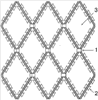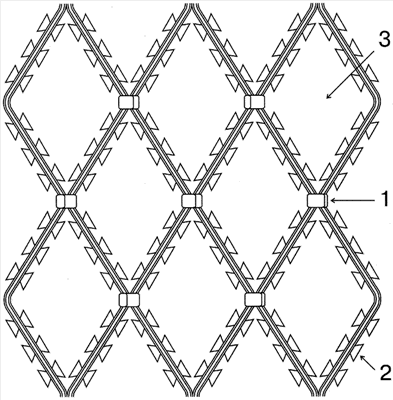 Наиболее близкой к предлагаемому изобретению является «Панель охранной сетки», взятая за прототип, содержащая скобы, армированную колючую ленту, выполненную из оцинкованной, высокоуглеродистой, стальной проволоки, на которой закреплена путем обжатия лента из оцинкованной стали с острыми диаметрально расположенными шипами, скобы соединяют нити проволоки в ячейки в виде ромбов (Патент WO 2005012673, Е04Н 17/04, 10.02.2005 г.). Недостаток такой охранной сетки состоит в том, что в ней не определен оптимальный размер ячеек сетки, от которого зависит количество нитей армированной колючей ленты, скоб, приходящихся на единицу площади, и время, расходуемое на обжатие скоб. Кроме того, при соединении нитей скобами не внахлест ухудшается надежность соединения, а следовательно, и надежность заграждения. Техническим результатом предлагаемого изобретения является изготовление колюще-режущей сетки с оптимальным соотношением диагоналей ромба, обеспечивающим надежность работы сетки заграждения во время ее эксплуатации на охраняемых объектах, в которой используется оптимальное количество армированной колючей ленты и скоб на определенной площади сетки заграждения. Поставленная цель достигается тем, что сетка заграждения содержит соединенные между собой нити армированной колючей ленты, выполненной из оцинкованной высокоуглеродистой стальной проволоки, с закрепленной на ней путем обжатия лентой из оцинкованной стали с острыми диаметрально расположенными колюще-режущими шипами, отличающаяся тем, что нити армированной колючей ленты соединены внахлест скобами из оцинкованной стали с образованием ячеек в виде ромбов с размерами диагоналей, равными (230±25) мм и (375±25) мм. Если нити армированной колючей ленты соединены с расположением диагоналей ромбов с размерами (230±25) мм по длине сетки, то диагонали с размером (375±25) мм по ее ширине и, наоборот, если нити армированной колючей ленты соединены с расположением диагоналей ромбов с размерами (375±25) мм по длине сетки, то диагонали ромбов с размерами (230±25) мм – по ее ширине. На чертеже приведена сетка заграждения общего вида. Сетка заграждения включает скобы 1, выполненные из оцинкованной стали, соединяющие нити проволоки 2 внахлест. Нити проволоки выполнены из оцинкованной высокоуглеродистой стальной проволоки, на которой закреплена путем обжатия лента из оцинкованной стали с острыми диаметрально расположенными шипами. Ячейки 3 сетки заграждения имеют вид ромбов, диагонали которых равны (230±25) мм, ширина (375±25) мм. Изготовление сетки заграждения осуществляется на станке, куда поступают скобы, выполненные из оцинкованной стали, оцинкованная высокоуглеродистая стальная проволока, лента из оцинкованной стали с острыми диаметрально расположенными шипами. С выхода станка снимается сетка заграждения, ячейки которой имеют вид ромбов, диагонали которых равны (230±25) мм и (375±25) мм или (375±25) мм и (230±25) мм, где ±25 мм – допустимые отклонения, возникающие при изготовлении и установке сетки заграждения. С выхода станка сетка заграждения поступает на намоточный барабан. Размер ячеек сетки заграждения определен экспериментальным путем, исходя из использования минимального количества нитей проволоки, скоб и надежности. Соединение нитей проволоки скобами внахлест увеличивает надежность сетки заграждения, т.к. при т