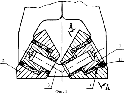 Изобретение поясняется чертежом, на котором фиг.1 изображает общий вид опоры долота в разрезе; фиг.2 – разрез А-А на фиг.1; фиг.3-5 варианты выполнения опоры и фиг.6 – сечение Б-Б на фиг.5.