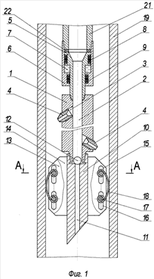 Устройство посредством муфты 6 закреплено на колонне НКТ 21. Между торцами втулки 5 и НКТ 21 установлена шайба 22, изготовленная из упругого материала.